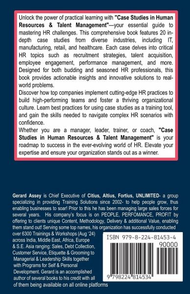 Unlock the power of practical learning with "Case Studies in Human Resources & Talent Management"-your essential guide to mastering HR challenges. This comprehensive book features 20 in-depth case studies from diverse industries, including IT, manufacturing, retail, and healthcare. Each case delves into critical HR topics such as recruitment strategies, talent acquisition, employee engagement, performance management, and more. Designed for both budding and seasoned HR professionals, this book provides actionable insights and innovative solutions to real-world problems. Discover how top companies implement cutting-edge HR practices to build high-performing teams and foster a thriving organizational culture. Learn best practices for using case studies as a training tool, and gain the skills needed to navigate complex HR scenarios with confidence. Whether you are a manager, leader, trainer, or coach, "Case Studies in Human Resources & Talent Management" is your roadmap to success in the ever-evolving world of HR. Elevate your expertise and ensure your organization stands out as a winner.