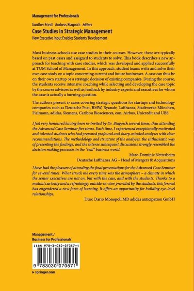 Most business schools use case studies in their courses. However, these are typically based on past cases and assigned to students to solve. This book describes a new approach for teaching with case studies, which was developed and applied successfully at TUM School of Management. In this approach, student teams write and solve their own case study on a topic concerning current and future businesses. A case can thus be on their own startup or a strategic decision of existing companies. During the course, the students receive intensive coaching while selecting and developing the case topic by the course advisors as well as feedback by industry experts and executives for whom the case is actually a burning question.