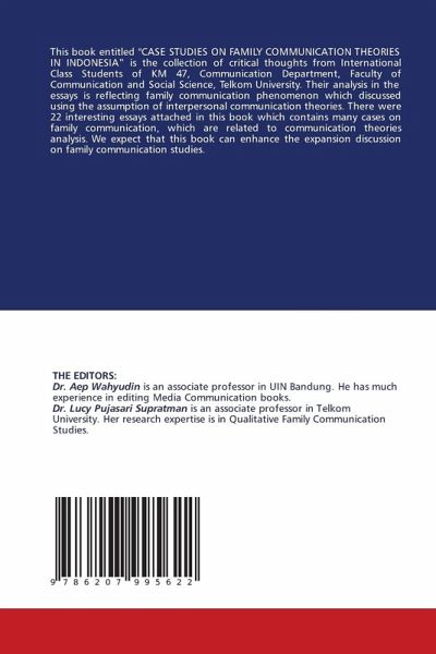 This book entitled "CASE STUDIES ON FAMILY COMMUNICATION THEORIES IN INDONESIA is the collection of critical thoughts from International Class Students of KM 47, Communication Department, Faculty of Communication and Social Science, Telkom University. Their analysis in the essays is reflecting family communication phenomenon which discussed using the assumption of interpersonal communication theories. There were 22 interesting essays attached in this book which contains many cases on family communication, which are related to communication theories analysis. We expect that this book can enhance the expansion discussion on family communication studies.