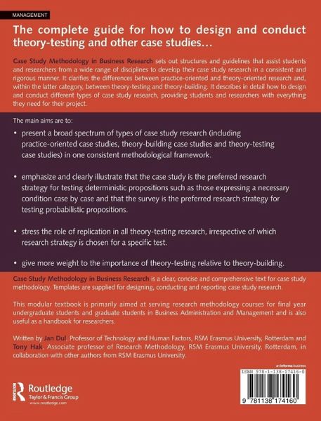 Foreword (Chris Voss, London Business School); Aims and overview of this book; A review of case studies in business research; Principles of empirical research; Theory-testing research. Theory-testing in case study research: Testing sufficient and necessary conditions; How to test a sufficient or a necessary condition;Case study 1: Testing a theory of collaboration characteristics of innovation projects; Methodological reflection on case study 1; Case study 2: Testing a theory of ideal typical organizational configurations of successful product innovations; Methodological reflection on case study 2; Testing a deterministic proportional relationship; How to test a deterministic proportional relationship; Case study 3: Testing the influence of urban time access windows on a retailer's distribution costs; Methodological reflection on case study 3; Testing a probabilistic proportional relationship; How to test a probabilistic proportional relationship; Case study 4: Testing the influence of a retailer's distribution strategy on a retailer's sensitivity to urban time access windows; Methodological reflection on case study 4. Other types of case study research: The pilot case study; How to design and conduct a pilot case study; Case study 5: Testing a theory of conditions of success of new products; Methodological reflection on Case study 5; The theory-building case study; How to design and conduct a theory-building case study; Case study 6: Exploring which company representatives are involved in communication with providers of business services; Methodological reflection on case study 7; The practice-oriented case study; How to design and conduct a practice-oriented case study; Case study 7: Building a model of best practice of company standardization;Methodological reflection on case study 7
