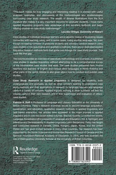 Case studies of individual language learners are a valuable means of illustrating issues connected with learning, using, and in some cases, losing another language. Yet, even though increasing numbers of graduate students and scholars conduct research using case studies or mix quantitative and qualitative methods, there are no dedicated applied linguistics research methods texts that guide one through the case study process. This book fills that gap. The volume provides an overview of case study methodology and examples of published case studies in applied linguistics, without attempting to be a comprehensive survey of the innumerable case studies that exist. The case studies presented here involve teachers and learners of English and various other languages in North America and other parts of the world. Advice is also given about how to conduct and publish case studies. Case Study Research in Applied Linguistics is designed for students, both undergraduate and graduate, as well as other scholars seeking to understand case study methods and their applications in research on language learners and language users in a variety of contexts. Applied linguists working in other subfields will find the volume useful in their own research and in their supervision and evaluation of others' case studies.