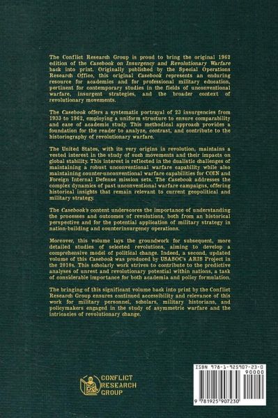 The Conflict Research Group is proud to bring the original 1962 edition of the Casebook on Insurgency and Revolutionary Warfare back into print. Originally published by the Special Operations Research Office, the original Casebook represents an enduring resource for academics and for professional military education, pertinent for contemporary studies in the fields of unconventional warfare, insurgent strategies, and the broader context of revolutionary movements. This book is a comprehensive anthology of 23 revolutionary warfare case studies from 1933 up to its year of original publication. The casebook offers a systematic portrayal of 23 insurgencies, employing a uniform structure to ensure comparability and ease of academic study. This methodical approach provides a foundation for the reader to analyze, contrast, and contribute to the historiography of revolutionary warfare. The United States, with its origins in revolution, maintains a vested interest in the study of such movements and their impacts on global stability. This interest is reflected in the dualistic challenges of maintaining a robust unconventional warfare capability while also maintaining counter-unconventional warfare capabilities for COIN and Foreign Internal Defense mission sets. The Casebook addresses the complex dynamics of past unconventional warfare campaigns, offering historical insights that remain relevant to current geopolitical and military strategy. The Casebook's content underscores the importance of understanding the processes and outcomes of revolutions, both from an historical perspective and for the potential application of military strategy in nation-building and counterinsurgency operations. Moreover, this volume lays the groundwork for subsequent, more detailed studies of selected revolutions, aiming to develop a comprehensive model of political change. Indeed, a second, updated volume of this casebook was produced by USASOC's ARIS Project in the 2010s. This scholarly work strives to contribute to the predictive analyses of unrest and revolutionary potential within nations, a task of considerable importance for both academia and policy formulation. The bringing of this significant volume back into print by the Conflict Research Group ensures continued accessibility and relevance of this work for military personnel, scholars, military historians, and policymakers engaged in the study of asymmetric warfare and the intricacies of revolutionary change.