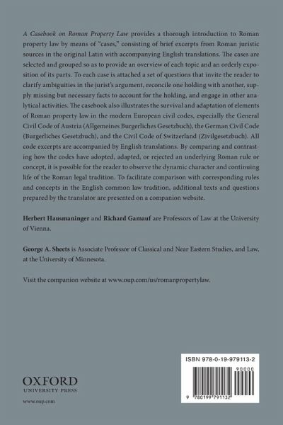 This book provides a thorough introduction to Roman property law by means of "cases," consisting of brief excerpts from Roman juristic sources in the original Latin with accompanying English translations. The cases are selected and grouped so as to provide an overview of each topic and an orderly exposition of its parts. To each case is attached a set of questions that invite the reader to, e.g., clarify ambiguities in the jurist's argument, reconcile one holding with another, supply missing but necessary facts to account for the holding, and/or engage in other analytical activities. The casebook also illustrates the survival and adaptation of elements of Roman property law in the modern European civil codes, especially the three most influential of those codes: the General Civil Code of Austria (Allgemeines Burgerliches Gesetzbuch), the German Civil Code (Burgerliches Gesetzbuch), and the Civil Code of Switzerland (Zivilgesetzbuch). All code excerpts are accompanied by English translations. By comparing and contrasting how the codes have adopted, adapted, or rejected an underlying Roman rule or concept, it is possible for the reader to observe the dynamic character and continuing life of the Roman legal tradition. To facilitate comparison with corresponding rules and concepts in the English common law tradition, additional texts and questions prepared by the translator will be mounted on an accompanying website, www.oup.com/us/romanpropertylaw. "