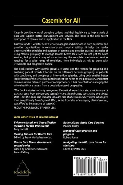 This book is vital for health service managers and clinicians, in both purchaser and provider organizations, in community and hospital settings. It helps the reader understand the principles and purposes of casemix and provides practical examples of using casemix groupings to manage services better. Its lessons are not just for acute services, but provide a way of understanding the complete spectrum of services required for a wide range of conditions, from individuals at risk to those with irreversible and progressive disease. The book explains why casemix groups are useful and the reasons for grouping and analysing patient records. It focuses on the difference between groupings of patients with conditions, and groupings of intervention episodes. Using both enables better identification of the services required to meet the needs of the population, and better communication between purchasers and providers. It has potential for managing the whole healthcare system from a population based perspective.