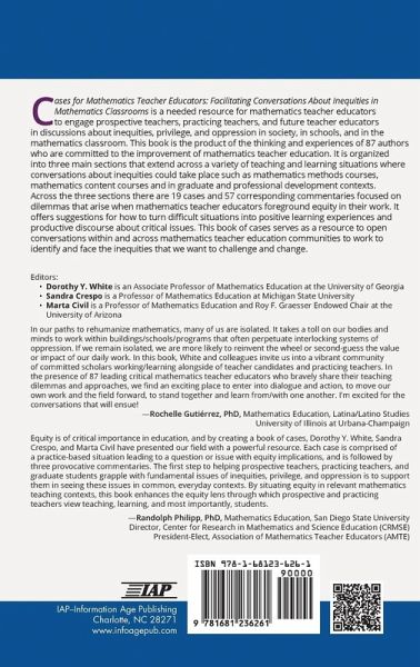 A volume in The Association of Mathematics Teacher Educators (AMTE) Professional Book Series The Association of Mathematics Teacher Educators (AMTE) in its 2015 position paper on Equity in Mathematics Teacher Education provides a list of actions for mathematics teacher educators (MTE's) to help them develop and implement equitable practices. The position paper states it is critical that mathematics teacher educators: "Model equity¿based pedagogy that emphasizes rich and rigorous mathematics; elicit and build on children's and young adults' mathematical thinking; connect to P¿12 students' cultural/linguistic knowledge and backgrounds as well as individual interests; facilitate mathematical discourse; minimize status issues by expanding broader participation and engagement where varied mathematical strengths are valued; and promote positive mathematical identity and agency (p. 2)". Cases for Mathematics Teacher Educators: Facilitating Conversations about Inequities in Mathematics Classrooms provides an excellent resource to start conversations describing the enactment of these actions. The book is organized into three main sections: (1) Conversations About Inequities in Mathematics Methods Courses, (2) Conversations About Inequities in Mathematics Content Courses, and (3) Conversations about Inequities in Graduate and Professional Development Contexts. Across these sections there are 19 cases and 57 corresponding commentaries focused on dilemmas that arise when mathematics teacher educators foreground equity in their work. This book of cases provides a needed resource for MTEs to engage prospective teachers, practicing teachers, and future teacher educators in discussions about inequities, privilege, and oppression in society, in schools, and in the mathematics classroom. It is the product of the thinking and experiences of 87 authors who are committed to the improvement of mathematics teacher education.