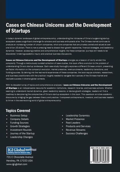 In today's dynamic landscape of global entrepreneurship, understanding the intricacies of China's burgeoning startup ecosystem poses a significant challenge for scholars and business enthusiasts alike. The Chinese market continues to produce an increasing number of unicorn companies, which are companies that are privately owned and valued at over one billion US dollars. There is now a pressing need to dissect their growth trajectories, financial strategies, and leadership dynamics. However, accessing credible and comprehensive insights into these companies' journeys still needs to be discovered, hindering academic inquiry and practical business discussions. Cases on Chinese Unicorns and the Development of Startups emerges as a beacon of clarity amidst this complexity. Through a meticulously curated collection of case studies, this book offers a solution to the problem of understanding China's startup landscape. Each case study thoroughly explores a different Chinese unicorn, presenting verifiable information on the company's evolution, market presence, revenue streams, leadership transitions, and funding sources. By delving into the real-world experiences of these companies, the book equips scholars, researchers, and business practitioners with the practical insights needed to navigate the nuances of the Chinese market and replicate success in diverse global contexts.