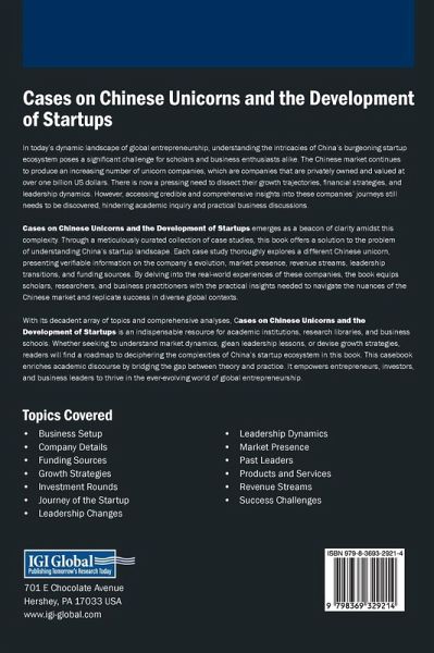 In today's dynamic landscape of global entrepreneurship, understanding the intricacies of China's burgeoning startup ecosystem poses a significant challenge for scholars and business enthusiasts alike. The Chinese market continues to produce an increasing number of unicorn companies, which are companies that are privately owned and valued at over one billion US dollars. There is now a pressing need to dissect their growth trajectories, financial strategies, and leadership dynamics. However, accessing credible and comprehensive insights into these companies' journeys still needs to be discovered, hindering academic inquiry and practical business discussions. Cases on Chinese Unicorns and the Development of Startups emerges as a beacon of clarity amidst this complexity. Through a meticulously curated collection of case studies, this book offers a solution to the problem of understanding China's startup landscape. Each case study thoroughly explores a different Chinese unicorn, presenting verifiable information on the company's evolution, market presence, revenue streams, leadership transitions, and funding sources. By delving into the real-world experiences of these companies, the book equips scholars, researchers, and business practitioners with the practical insights needed to navigate the nuances of the Chinese market and replicate success in diverse global contexts.