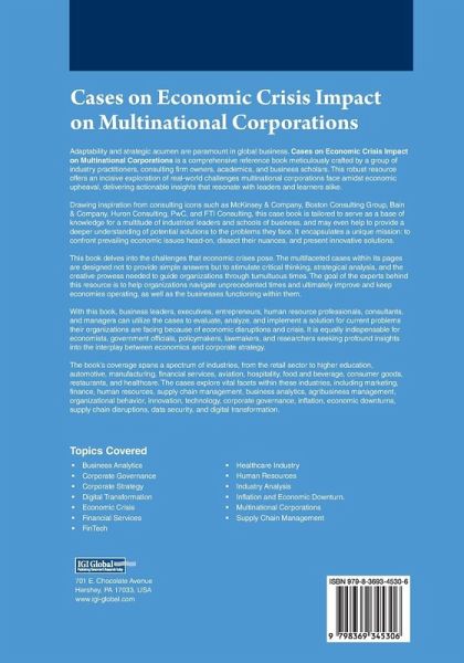 Adaptability and strategic acumen are paramount in global business. Cases on Economic Crisis Impact on Multinational Corporations is a comprehensive reference book meticulously crafted by a group of industry practitioners, consulting firm owners, academics, and business scholars. This robust resource offers an incisive exploration of real-world challenges multinational corporations face amidst economic upheaval, delivering actionable insights that resonate with leaders and learners alike. This book delves into the challenges that economic crises pose. The multifaceted cases within its pages are designed not to provide simple answers but to stimulate critical thinking, strategical analysis, and the creative prowess needed to guide organizations through tumultuous times. The goal of the experts behind this resource is to help organizations navigate unprecedented times and ultimately improve and keep economies operating, as well as the businesses functioning within them.