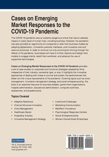 The COVID-19 pandemic was an extreme exogenous shock that had an adverse impact on every facet of human lives, including business. However, the pandemic has also provided an opportunity for companies to alter their business models by adopting digitalization, innovative customer interfaces, and innovative cost and revenue structures. In order to continue not only surviving but thriving through the effects of the pandemic, businesses will have to further improve and realign their models to engage clients, reskill their workforce, and advance the use of supportive technologies. Cases on Emerging Market Responses to the COVID-19 Pandemic provides a set of case studies on corporate and functional strategies adopted by firms irrespective of their industry, ownership type, or size. It highlights the innovative approaches of dealing with crises to survive and sustain the performances that better suit the unique requirements of the pandemic. Covering topics such as crisis management, innovative management strategy, and social entrepreneurship, this book is an essential resource for business leaders, government organizations, hospital administration, educational administration, computer scientists, researchers, and academicians.