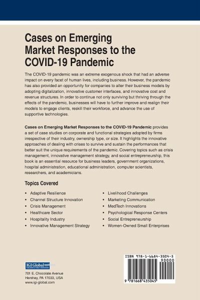 The COVID-19 pandemic was an extreme exogenous shock that had an adverse impact on every facet of human lives, including business. However, the pandemic has also provided an opportunity for companies to alter their business models by adopting digitalization, innovative customer interfaces, and innovative cost and revenue structures. In order to continue not only surviving but thriving through the effects of the pandemic, businesses will have to further improve and realign their models to engage clients, reskill their workforce, and advance the use of supportive technologies. Cases on Emerging Market Responses to the COVID-19 Pandemic provides a set of case studies on corporate and functional strategies adopted by firms irrespective of their industry, ownership type, or size. It highlights the innovative approaches of dealing with crises to survive and sustain the performances that better suit the unique requirements of the pandemic. Covering topics such as crisis management, innovative management strategy, and social entrepreneurship, this book is an essential resource for business leaders, government organizations, hospital administration, educational administration, computer scientists, researchers, and academicians.