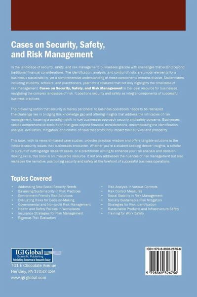 In the landscape of security, safety, and risk management, businesses grapple with challenges that extend beyond traditional financial considerations. The identification, analysis, and control of risks are pivotal elements for a business's sustainability, yet a comprehensive understanding of these components remains elusive. Stakeholders, including students, scholars, and practitioners, yearn for a resource that not only highlights the timeliness of risk management. Cases on Security, Safety, and Risk Management is the ideal resource for businesses navigating the complex landscape of risk. It positions security and safety as integral components of successful business practices. The prevailing notion that security is merely peripheral to business operations needs to be reshaped. The challenge lies in bridging this knowledge gap and offering insights that address the intricacies of risk management, fostering a paradigm shift in how businesses approach security and safety concerns. Businesses need a comprehensive exploration that goes beyond financial considerations, encompassing the identification, analysis, evaluation, mitigation, and control of risks that profoundly impact their survival and prosperity.