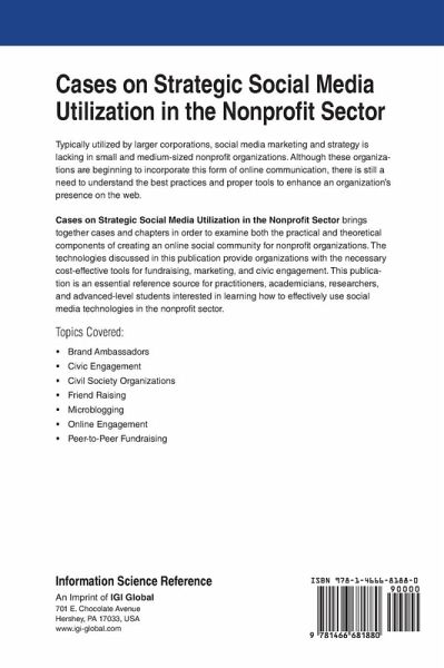 Typically utilized by larger corporations, social media marketing and strategy is lacking in small and medium-sized nonprofit organizations. Although these organizations are beginning to incorporate this form of online communication, there is still a need to understand the best practices and proper tools to enhance an organization's presence on the web. Cases on Strategic Social Media Utilization in the Nonprofit Sector brings together cases and chapters in order to examine both the practical and theoretical components of creating an online social community for nonprofit organizations. The technologies discussed in this publication provide organizations with the necessary cost-effective tools for fundraising, marketing, and civic engagement. This publication is an essential reference source for practitioners, academicians, researchers, and advanced-level students interested in learning how to effectively use social media technologies in the nonprofit sector.