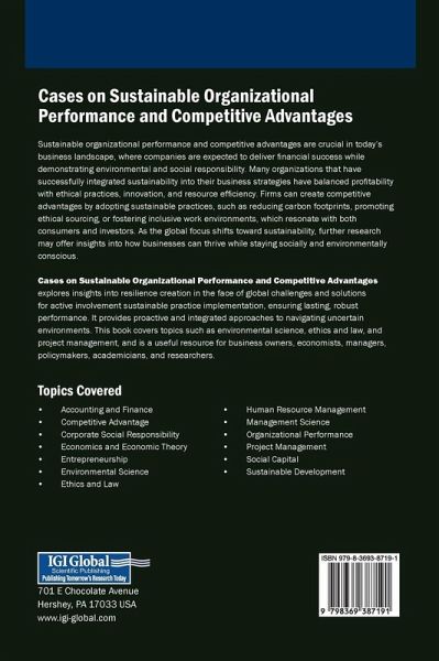 Sustainable organizational performance and competitive advantages are crucial in today's business landscape, where companies are expected to deliver financial success while demonstrating environmental and social responsibility. Many organizations that have successfully integrated sustainability into their business strategies have balanced profitability with ethical practices, innovation, and resource efficiency. Firms can create competitive advantages by adopting sustainable practices, such as reducing carbon footprints, promoting ethical sourcing, or fostering inclusive work environments, which resonate with both consumers and investors. As the global focus shifts toward sustainability, further research may offer insights into how businesses can thrive while staying socially and environmentally conscious. Cases on Sustainable Organizational Performance and Competitive Advantages explores insights into resilience creation in the face of global challenges and solutions for active involvement sustainable practice implementation, ensuring lasting, robust performance. It provides proactive and integrated approaches to navigating uncertain environments. This book covers topics such as environmental science, ethics and law, and project management, and is a useful resource for business owners, economists, managers, policymakers, academicians, and researchers.