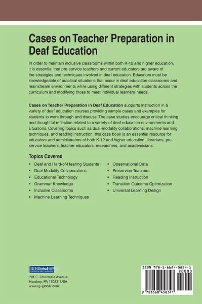 In order to maintain inclusive classrooms within both K-12 and higher education, it is essential that pre-service teachers and current educators are aware of the strategies and techniques involved in deaf education. Educators must be knowledgeable of practical situations that occur in deaf education classrooms and mainstream environments while using different strategies with students across the curriculum and modifying those to meet individual learners' needs. Cases on Teacher Preparation in Deaf Education supports instruction in a variety of deaf education courses providing sample cases and examples for students to work through and discuss. The case studies encourage critical thinking and thoughtful reflection related to a variety of deaf education environments and situations. Covering topics such as dual-modality collaborations, machine learning techniques, and reading instruction, this case book is an essential resource for educators and administrators of both K-12 and higher education, librarians, pre-service teachers, teacher educators, researchers, and academicians.