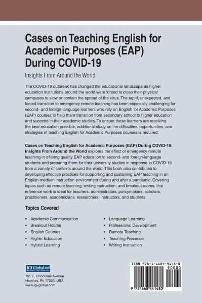 The COVID-19 outbreak has changed the educational landscape as higher education institutions around the world were forced to close their physical campuses to slow or contain the spread of the virus. The rapid, unexpected, and forced transition to emergency remote teaching has been especially challenging for second- and foreign-language learners who rely on English for Academic Purposes (EAP) courses to help them transition from secondary school to higher education and succeed in their academic studies. To ensure these learners are receiving the best education possible, additional study on the difficulties, opportunities, and strategies of teaching English for Academic Purposes courses is required. Cases on Teaching English for Academic Purposes (EAP) During COVID-19: Insights From Around the World explores the effect of emergency remote teaching in offering quality EAP education to second- and foreign-language students and preparing them for their university studies in response to COVID-19 from a variety of contexts around the world. This book also contributes to developing effective practices for supporting and sustaining EAP teaching in an English-medium instruction environment during and after a pandemic. Covering topics such as remote teaching, writing instruction, and breakout rooms, this reference work is ideal for teachers, administrators, policymakers, scholars, practitioners, academicians, researchers, instructors, and students.