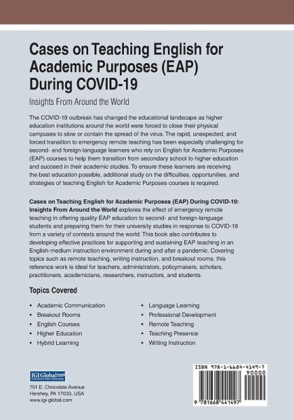 The COVID-19 outbreak has changed the educational landscape as higher education institutions around the world were forced to close their physical campuses to slow or contain the spread of the virus. The rapid, unexpected, and forced transition to emergency remote teaching has been especially challenging for second- and foreign-language learners who rely on English for Academic Purposes (EAP) courses to help them transition from secondary school to higher education and succeed in their academic studies. To ensure these learners are receiving the best education possible, additional study on the difficulties, opportunities, and strategies of teaching English for Academic Purposes courses is required. Cases on Teaching English for Academic Purposes (EAP) During COVID-19: Insights From Around the World explores the effect of emergency remote teaching in offering quality EAP education to second- and foreign-language students and preparing them for their university studies in response to COVID-19 from a variety of contexts around the world. This book also contributes to developing effective practices for supporting and sustaining EAP teaching in an English-medium instruction environment during and after a pandemic. Covering topics such as remote teaching, writing instruction, and breakout rooms, this reference work is ideal for teachers, administrators, policymakers, scholars, practitioners, academicians, researchers, instructors, and students.