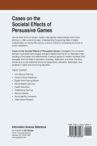 Like all other forms of modern media, video games impact society and human behavior in often surprising ways. Understanding the growing effect of digital entertainment on twenty-first century culture is critical to anticipating the future of social interactions. Cases on the Societal Effects of Persuasive Games investigates the connection between multimedia technologies and game-based learning for an improved understanding of the impact and effectiveness of serious games in modern societies. With examples from the fields of education, business, healthcare, and more, this book serves as a crucial reference source for researchers, educators, developers, and students in higher and continuing education.