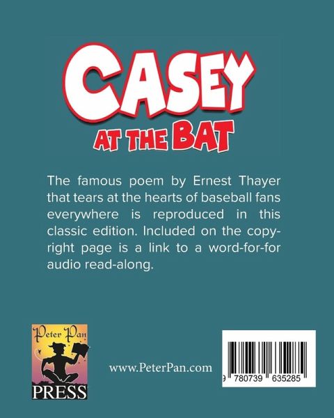 Casey at the Bat by Ernest Thayer is a classic American poem about Mudville's baseball team, trailing in the final inning. With two outs, the crowd's last hope rests on the mighty Casey. Confidence fills the air as he steps up to bat. He lets the first two pitches pass, striking twice. On the final pitch, he swings-but misses! The crowd is left in stunned silence. This timeless narrative captures the drama of sports, the highs of hope, and the crushing weight of failure, making it a must-read for baseball fans and lovers of classic storytelling alike. Included on the inside cover is a link to a word-for-for audio read-along.
