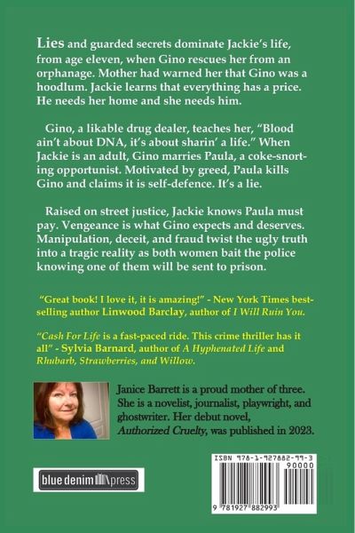 Lies and guarded secrets dominate Jackie's life, from age eleven, when Gino rescues her from an orphanage. Mother had warned her that Gino was a hoodlum. Jackie learns that everything has a price. He needs her home and she needs him. Gino, a likable drug dealer, teaches her, "Blood ain't about DNA, it's about sharin' a life." When Jackie is an adult, Gino marries Paula, a coke-snorting opportunist. Motivated by greed, Paula kills Gino and claims it is self-defence. It's a lie. Raised on street justice, Jackie knows Paula must pay. Vengeance is what Gino expects and deserves. Manipulation, deceit, and fraud twist the ugly truth into a tragic reality as both women bait the police knowing one of them will be sent to prison.