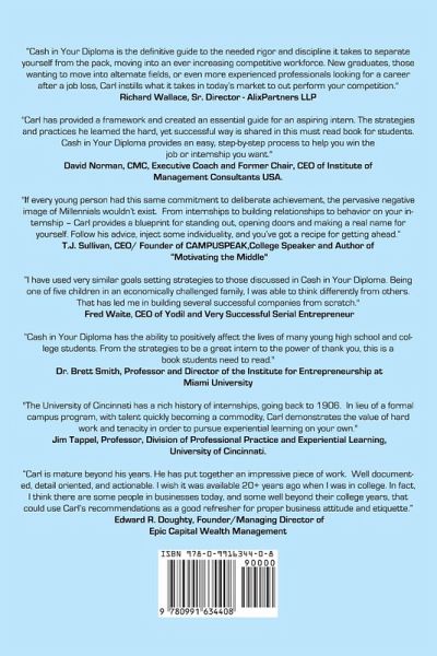 Cash in Your Diploma is an easy to follow guide on how to get the internship or job that you want. It is written from a college student's perspective to provide the most up to date strategies and tactics for a successful search. This is a must read for students graduating high school and any student in college looking to get ahead on their career. Cash in Your Diploma is applicable to anyone, regardless of your background.