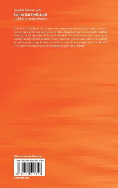 Preface.- Methods of Isolation and Chemistry of Cardanol.- Cardanol Derived Surfactants and Their Nanomicelles.- Cardanol Based High Performance Macromolecules.- Cardanol Based Self-assembled Nanostructures.- Cardanol Derived Nano-templates.- Cardanol Metal Nano-hybrid Assemblies.- Cardanol Based Liquid Crystals and NLO materials.- Cardanol Based Materials in Nanomedicine.- Industrial Applications of Cardanol Derived Materials.- Future Perspectives on Cardanol Based Green Nanotechnology.- Subject Index.