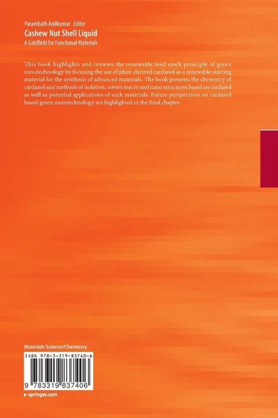 Preface.- Methods of Isolation and Chemistry of Cardanol.- Cardanol Derived Surfactants and Their Nanomicelles.- Cardanol Based High Performance Macromolecules.- Cardanol Based Self-assembled Nanostructures.- Cardanol Derived Nano-templates.- Cardanol Metal Nano-hybrid Assemblies.- Cardanol Based Liquid Crystals and NLO materials.- Cardanol Based Materials in Nanomedicine.- Industrial Applications of Cardanol Derived Materials.- Future Perspectives on Cardanol Based Green Nanotechnology.- Subject Index.