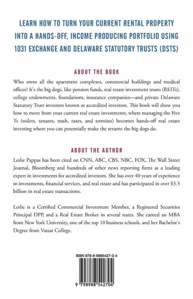 REVISED FOR 2023 Widely regarded as the most complete and readable of the alternatives written on the Delaware Statutory Trust (DST) and 1031 Exchange space, this version of Cashing In Tax Free has been rewritten to 2023 standards and topics. Leslie Pappas has assisted hundreds of real estate investors in the sale of their rental properties, performing tax deferred 1031 Exchanges, and reinvestment into often more diversified and profitable large-scale real estate holding structures as DSTs. Professional asset and property managers, experienced and proven experts, select, purchase, upgrade and operate Delaware Statutory Trusts to maximize cash flow and long-term returns. The book lets you peek into the lives and portfolios of Pappas' real clients who have used this strategy and benefitted from doing so. The book also details more sophisticated uses of institutional investing like Sequential 1031 Exchanges, maximizing depreciation and long-term estate planning concepts. It's a can't miss for any serious real estate investor. If you are interested in becoming a DST real estate investor but need to understand how the industry works -- this is the book for you. Cashing In Tax Free outlines the benefits, process, and must-knows of institutional investments. You'll be able to decide if this is a good fit for you and if so, how to select professional advisors, and which strategies to use to boost your investments.