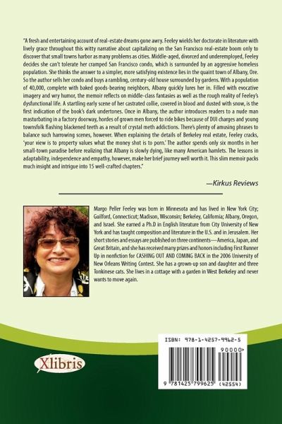 CASHING OUT AND COMING BACK is a humorous personal narrative about "cashing out" my Berkeley inner city condo in the San Francisco Bay Area real estate boom to follow my dream of living in a historical house in a small town (Albany) in Oregon without really knowing what I was getting into. I tell the story as a memoir, a version of which is contemplated by many urban dwellers who yearn for a more affordable and pastoral life Elsewhere, and by many women in particular, who want to make a big life change, which doesn't necessarily involve a lover or a red Jag. The major theme is appearance and reality and the fantasies we talk ourselves into. The big picture, beyond my moving and regretting it, is the dying economy and culture of small town America, the unemployment and meth use evident in the phenomenon of the "Dewy Bikers," men who cycle the streets of Albany because they have lost their driving licenses due to substance abuse. In an even larger sense, the book is about various states of home and homelessness. In later chapters I become an advocate for two children who are hapless victims of the problems of their town.