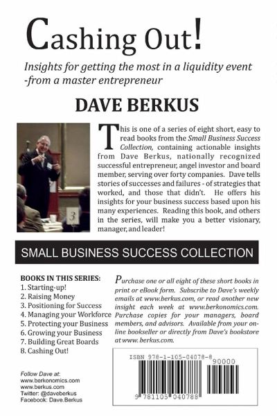When and how do you position for selling your share of a small business? How can you get a higher price? What do you do in advance? Do you hire an investment banker? What is the process? This is one of a series of eight short, easy to read books from the Small Business Success Collection, containing actionable insights from Dave Berkus, nationally recognized successful entrepreneur, angel investor and board member, serving over forty companies. Dave tells stories of successes and failures - of strategies that worked, and those that didn't. He offers his insights for your business success based upon his many experiences. Reading this book, and others in the series, will make you a better visionary, manager, and leader! (Newly expanded second edition.)