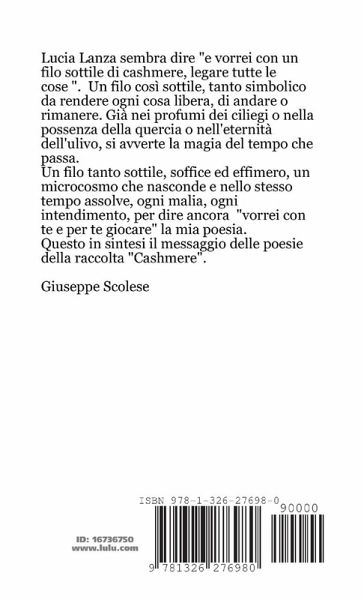 Lucia Lanza sembra dire " e vorrei con un filo sottile di cashmere, legare tutte le cose " Un filo così sottile, tanto simbolico da rendere ogni cosa libera, di andare o rimanere. Già nei profumi dei ciliegi o nella possenza della quercia o nell'eternità dell'ulivo, si avverte la magia del tempo che passa. Un filo tanto sottile, soffice ed effimero, un microcosmo che nasconde e nello stesso tempo assolve, ogni malia, ogni intendimento, per dire ancora " vorrei con te e per te giocare " la mia poesia. Questo in sintesi il messaggio delle poesie della raccolta "Cashmere". Giuseppe Scolese