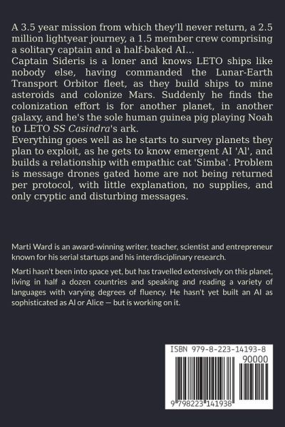 "there's a difference between being a loner and being alone" A 3.5 year mission from which they'll never return, a 2.5 million lightyear journey to another galaxy, a 1.5 member crew comprising a solitary captain and a half-baked AI... Captain Sideris is a loner and knows LETO ships like nobody else, having risen to command the Lunar-Earth construction fleet, as they build ships to mine asteroids and colonize Mars. Suddenly he finds the colonization effort is for another planet, in another galaxy, and he's the sole human guinea pig being gated through a wormhole with an AI playing Noah to LETO SS Casindra's ark. Everything goes well as he starts to survey four planets they plan to exploit, as he gets to know emergent AI 'Al', as he discovers he's building a special relationship with empathic cat 'Simba'. Problem is message drones gated home are not being returned per protocol, with little explanation, no supplies, and some cryptic and disturbing messages. This full length novel reminiscent of Clarke and Asimov is set in the multi-author multi-genre Paradisi universe. Casindra Lost opens the Lost Mission Series which explains what happened to some of the early missions that underlie the various Paradisi colonization and post-colonization stories. Welcome to the Paradisi Chronicles... It's not Alice down the rabbithole, but Sideris down the wormhole. And that's just the start of the story. It's not the old man and the sea, more like the old man and the galaxy. The enemy is not a whale, but a whale of an asteroid... And that's the start of another story. Word to the Wise: This is the Lost Mission Series. So it's not really a cliffhanger ending when the missions end up, you know, lost! For those that are familiar with the Paradisi Chronicles universe already, this series fills in backstory to the earlier books. Casindra Lost and Moraturi Lost take us on two different ships as they commence their mission, and each is the start of a separate arc, arcs that take several books to resolve. But the stories are not independent, and intertwine in a multitude of ways - still you can read either arc independently, starting either one and picking up the other later. Casindra Lost won the Gold Medal in Science Fiction in the 2021 Global Book Awards for Self-Publishing, and Moraturi Lost won Silver in Science Fiction/Adventure. Moraturi Ring won Silver for Science Fiction Series in the 2021 Global Book Awards. "If you enjoyed The Martian, and were looking for something better than Ad Astra, Casindra Lost is for you!" - Guy Wheatley, Amazon Reviewer "This was like a glimps into the future, we will someday be taking similar missions. I would call this a must read for sci-fi fans." - K. N., Amazon Reviewer