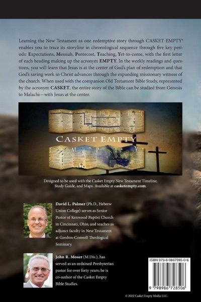Learning the New Testament as one redemptive story through CASKET EMPTY® enables you to trace its storyline in chronological sequence through five key periods: Expectations, Messiah, Pentecost, Teaching, and Yet-to-come, represented by the acronym EMPTY. This twelve-week Bible study has weekly summaries, Bible readings, and questions for reflection and discussion. Through this study you will learn that Jesus is at the center of God's plan of redemption and that God's saving work in Christ advances through the expanding missionary witness of the church. When used with the companion Old Testament Bible Study, represented by the acronym CASKET, the entire story of the Bible can be studied from Genesis to Malachi.