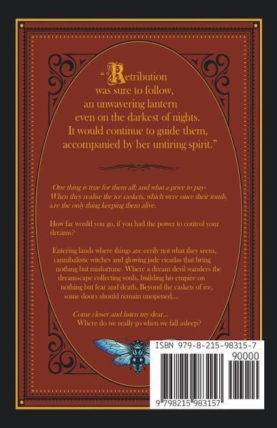 "Retribution was sure to follow, an unwavering lantern even on the darkest of nights. It would continue to guide them, accompanied by her untiring spirit."One thing is true for them all; and what a price to pay-When they realise the ice caskets, which were once their tomb, are the only thing keeping them alive. How far would you go, if you had the power to control your dreams? Entering lands where things are eerily not what they seem, cannibalistic witches and glowing jade cicadas that bring nothing but misfortune. Where a dream devil wanders the dreamscape collecting souls, building his empire on nothing but fear and death. Beyond the caskets of ice, some doors should remain unopened.... Come closer and listen my dear... Where do we really go when we fall asleep?