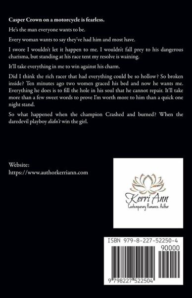 Casper Crown on a motorcycle is fearless. He's the man everyone wants to be. Every woman wants to say they've had him and most have. I swore I wouldn't let it happen to me. I wouldn't fall prey to his dangerous charisma, but standing at his race tent my resolve is waining. It'll take everything in me to win against his charm. To keep my secrets hidden. We all have them. Some darker than others. I've avoided relationships for moments exactly like this. Why you may ask? Well, someone always learns your darkest pain that you've tried to bury deep. My secret is one that I've worked too hard to hide. A lifetime ago and a person I don't wish to be again is hidden in that past. It's something I don't wish to dredge up. That Circe is long dead. Or so I thought. When my job at a Sports Network hurls me into the path of Casper Crown, the sexy, and young racing phenomenon, I know this could venture from the strictly professional to something more. No matter how hard I try to stay away, I find myself drawn to Casper. Every feeble attempt to avoid him brings us together. The closer I come, I find he's not at all who he seems. Sure, Casper on a motorcycle may be fearless, and in the bedroom he lights the tires, but even the champion can't outrun the truth. And if I wish to keep my secrets just as that- secrets - then I need to avoid the pull of my heart. Casper Crown is a distraction I can't afford no matter how I wish I could.