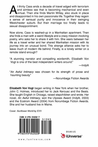 At thirty Cass ends a decade of travel edged with terrorism and aimless sex that is becoming mechanical and even virtual. Then she finds Martin Willey, also stuck in place and disappointed in his own passionate life. Together they regain a sense of sensual purity and innocence in their swinging Westchester suburb. But their marriage too finally leads to sexual disappointment. Now alone, Cass is washed-up in a Manhattan apartment. Then she finds a man with a weird lifestyle and a crazy mission involving poetry, who asks her to share it with him. She veers between her life as a travel writer and her shared Manhattan mission with its journey into an unusual bond. This strange alliance asks her to leave much of modern life behind. Finally, is a lonely winter on a remote island enough? "A stunning narrator and compelling wordsmith, Elizabeth Von Vogt is one of the best independent writers around." Indylit "An Awful Intimacy was chosen for its strength of prose and haunting beauty." Norumbega Fiction Awards