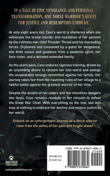 In a tale of epic vengeance and personal transformation, one Norse warrior's quest for justice and redemption unfolds. At only eight years old, Cass's world is shattered when she witnesses the brutal murder and mutilation of her parents by the ruthless war chief Thunder Throat and his marauding forces. Orphaned and consumed by a quest for vengeance, she finds solace and guidance from a powerful spirit, her twin sister, and a devoted extended family. As the years pass, Cass endures rigorous training, driven by an unyielding desire to reclaim her lost world and avenge the unspeakable wrongs committed against her family. Her journey takes her from the haunting ruins of her village to a fateful battle against the greatest warrior of her time. Despite the doubts of her elders and the relentless dangers she faces, Cass remains resolute in her mission to defeat the Great War Chief. With everything on the line, she will stop at nothing to embrace her destiny and restore justice to her world. Embark on an unforgettable journey of courage and resolve.
