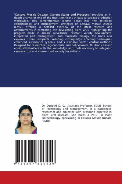 "Cassava Mosaic Disease: Current Status and Prospects" provides an in-depth analysis of one of the most significant threats to cassava production worldwide. This comprehensive volume delves into the aetiology, epidemiology, and management strategies of Cassava Mosaic Disease (CMD), offering a detailed overview of the latest research and advancements in combating this devastating plant virus. Highlighting the progress made in disease surveillance, resistant variety development, integrated pest management, and molecular biology, the book also explores future prospects, including cutting-edge breeding techniques, enhanced surveillance systems, and sustainable vector control methods. Designed for researchers, agronomists, and policymakers, this book aims to equip stakeholders with the knowledge and tools necessary to safeguard cassava crops and ensure food security for millions.