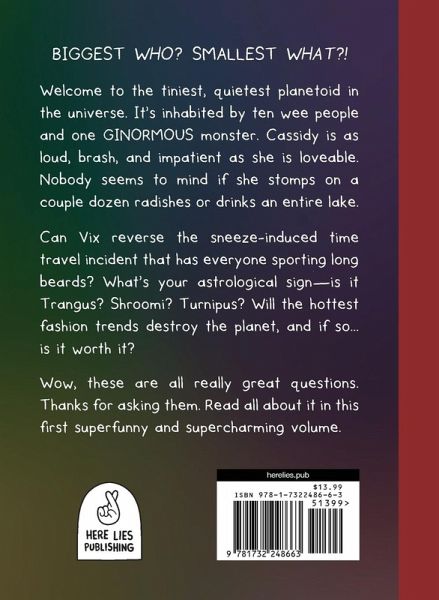 Welcome to the tiniest, quietest planetoid in the universe. It's inhabited by ten wee people and one GINORMOUS monster. Cassidy is as loud, brash, and impatient as she is loveable. Nobody seems to mind if she stomps on a couple dozen radishes or drinks an entire lake. Can Vix reverse the sneeze-induced time travel incident that has everyone sporting long beards? What's your astrological sign-is it Trangus? Shroomi? Turnipus? Will the hottest fashion trends destroy the planet, and if so... is it worth it? Wow, these are all really great questions. Thanks for asking them. Read all about it in this first superfunny and supercharming volume.