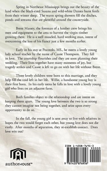 Spring in Northeast Mississippi brings out the beauty of the land when the black-eyed Susans and wild-white Daisies burst forth from their winter sleep. The warm spring showers fill the ditches, ponds and streams that are plentiful around the countryside. Brent Massey, the foreman of a lumber crew brings his men and equipment to the area to harvest the virgin timber growing there. He is a well muscled, hard working man, intent of overcoming the loss of his fiancé just a few months earlier. Early in his stay at Pocotolo, MS., he meets a lovely young lady school teacher by the name of Cassie Thompson. They fall in love. The courtship flourishes and they are soon planning their wedding. Their lives together have many moments of joy, but tragedy strikes and Cassie is left to go on with her life without Brent. Three lovely children were born to this marriage, and they help fill the void left in her life. Willie, a handsome young boy is their first born. In his early teens he falls in love with a lovely young girl who lives on an adjacent farm. Both families object to the relationship and are intent on keeping them apart. The young love between the two is strong they cannot imagine not being together, and seize upon every opportunity to do so. In the fall, the young girl is sent away to live with relative in hopes the two would forget each other, but young love does not die easily. After months of separation, they re-establish contact. Does love win out?