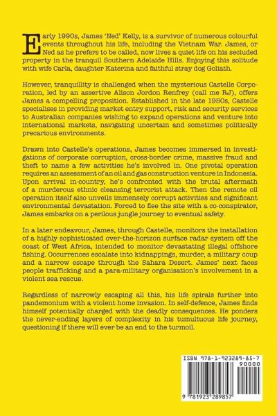 Early 1990s, James 'Ned' Kelly, is a survivor of numerous colourful events throughout his life, including the Vietnam War. James, or Ned as he prefers to be called, now lives a quiet life on his secluded property in the tranquil Southern Adelaide Hills. Enjoying this solitude with wife Carla, daughter Katerina and faithful stray dog Goliath. However, tranquillity is challenged when the mysterious Castelle Corporation, led by an assertive Alison Jordon Renfrey (call me RJ), offers James a compelling proposition. Established in the late 1950s, Castelle specialises in providing market entry support, risk and security services to Australian companies wishing to expand operations and venture into international markets, navigating uncertain and sometimes politically precarious environments. Drawn into Castelle's operations, James becomes immersed in investigations of corporate corruption, cross-border crime, massive fraud and theft to name a few activities he's involved in. One pivotal operation requires an assessment of an oil and gas construction venture in Indonesia. Upon arrival in-country, he's confronted with the brutal aftermath of a murderous ethnic cleansing terrorist attack. Then the remote oil operation itself also unveils immensely corrupt activities and significant environmental devastation. Forced to flee the site with a co-conspirator, James embarks on a perilous jungle journey to eventual safety. In a later endeavour, James, through Castelle, monitors the installation of a highly sophisticated over-the-horizon surface radar system off the coast of West Africa, intended to monitor devastating illegal off shore fi shing. Occurrences escalate into kidnappings, murder, a military coup and a narrow escape through the Sahara Desert. James' next faces people trafficking and a para-military organisation's involvement in a violent sea rescue. Regardless of narrowly escaping all this, his life spirals further into pandemonium with a violent home invasion. In self-defence, James finds himself potentially charged with the deadly consequences. He ponders the never-ending layers of complexity in his tumultuous life journey, questioning if there will ever be an end to the turmoil.