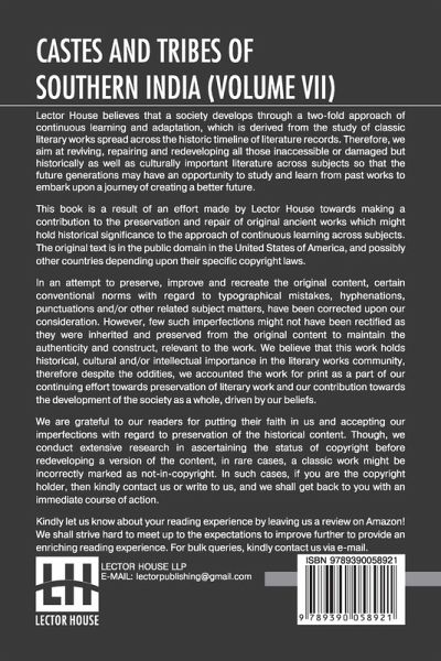 Castes And Tribes Of Southern India (Volume VII): Volume VII-T To Z, Assisted By K. Rangachari, M.A. This book is a result of an effort made by us towards making a contribution to the preservation and repair of original classic literature. In an attempt to preserve, improve and recreate the original content, we have worked towards: 1. Type-setting & Reformatting: The complete work has been re-designed via professional layout, formatting and type-setting tools to re-create the same edition with rich typography, graphics, high quality images, and table elements, giving our readers the feel of holding a 'fresh and newly' reprinted and/or revised edition, as opposed to other scanned & printed (Optical Character Recognition - OCR) reproductions. 2. Correction of imperfections: As the work was re-created from the scratch, therefore, it was vetted to rectify certain conventional norms with regard to typographical mistakes, hyphenations, punctuations, blurred images, missing content/pages, and/or other related subject matters, upon our consideration. Every attempt was made to rectify the imperfections related to omitted constructs in the original edition via other references. However, a few of such imperfections which could not be rectified due to intentional\unintentional omission of content in the original edition, were inherited and preserved from the original work to maintain the authenticity and construct, relevant to the work. We believe that this work holds historical, cultural and/or intellectual importance in the literary works community, therefore despite the oddities, we accounted the work for print as a part of our continuing effort towards preservation of literary work and our contribution towards the development of the society as a whole, driven by our beliefs. We are grateful to our readers for putting their faith in us and accepting our imperfections with regard to preservation of the historical content. HAPPY READING!