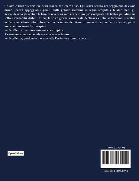 Un alto e tetro silenzio era nella stanza di Cesare Dias. Egli stava seduto nel seggiolone di cuoio bruno, teneva appoggiati i gomiti sulla grande scrivania di legno scolpito e le due mani gli nascondevano gli occhi e la fronte: si vedean solo i capelli un pö scomposti e le labbra pallidissime sotto i mustacchi disfatti. Fuori, la triste giornata invernale declinava e tetre si facevano le ombre nell¿austera stanza, tetre intorno a quella immobile figura di uomo di cui, nell¿alto silenzio, parea non si udisse neanche il respiro. ¿ Eccellenza... ¿ mormorò una voce trepida. Cesare non si mosse: sembrava non avesse inteso. ¿ Eccellenza, perdonate... ¿ ripetette l¿esitante e tremula voce. ...