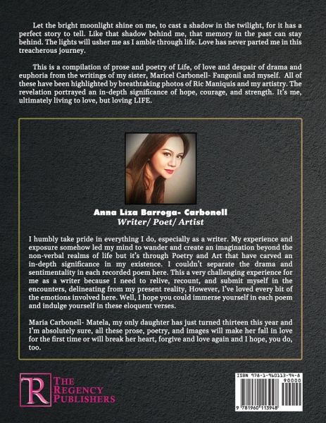 Let the bright moonlight shine on me, to cast a shadow in the twilight, for it has a perfect story to tell. Like that shadow behind me, that memory in the past can stay behind. The lights will usher me as I amble through life. Love has never parted me in this treacherous journey. This is a compilation of prose and poetry of Life, of love and despair of drama and euphoria from the writings of my sister, Maricel Carbonell- Fangonil and myself. All of these have been highlighted by breathtaking photos of Ric Maniquis and my artistry. The revelation portrayed an in-depth significance of hope, courage, and strength. It's me, ultimately living to love, but loving LIFE.