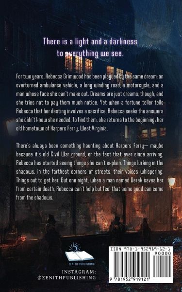 For two years, Rebecca Grimwood has been plagued by the same dream: an overturned ambulance vehicle, a long winding road, a motorcycle, and a man whose face she can't make out. Dreams are just dreams, though, and she tries not to pay them much notice. Yet when a fortune teller tells Rebecca that her destiny involves a sacrifice, Rebecca seeks the answers she didn't know she needed. To find them, she returns to the beginning: her old hometown of Harpers Ferry, West Virginia. There's always been something haunting about Harpers Ferry- maybe because it's old Civil War ground, or the fact that ever since arriving, Rebecca has started seeing things she can't explain. Things lurking in the shadows, in the farthest corners of streets, their voices whispering. Things out to get her. But one night, when a man named Derek saves her from certain death, Rebecca can't help but feel that some good can come from the shadows.