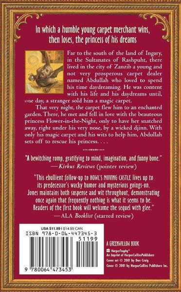 In this stunning sequel to Howl's Moving Castle, Diana Wynne Jones has again created a large-scale, fast-paced fantasy in which people and things are never quite what they seem. There are good and bad djinns, a genie in a bottle, wizards, witches, cats and dogs (but are they cats and dogs?), and a mysterious floating castle filled with kidnapped princesses, as well as two puzzling prophecies. The story speeds along with tantalizing twists and turns until the prophecies are fulfilled, true identities are revealed, and all is resolved in a totally satisfying, breathtaking, surprise-filled ending.
