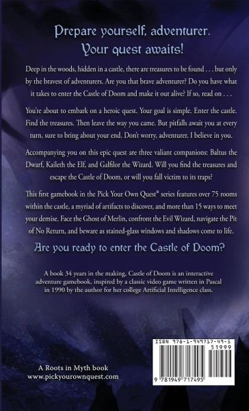 Prepare yourself, adventurer. Your quest awaits! Deep in the woods, hidden in a castle, there are treasures to be found . . . but only by the bravest of adventurers. Are you that brave adventurer? Do you have what it takes to enter the Castle of Doom and make it out alive? If so, read on . . . You're about to embark on a heroic quest. Your goal is simple. Enter the castle. Find the treasures. Then leave the way you came. But pitfalls await you at every turn, sure to bring about your end. Don't worry, adventurer. I believe in you. Accompanying you on this epic quest are three valiant companions: Baltus the Dwarf, Kaileth the Elf, and Galfilor the Wizard. Will you find the treasures and escape the Castle of Doom, or will you fall victim to its traps? This first gamebook in the Pick Your Own Quest® series features over 75 rooms within the castle, a myriad of artifacts to discover, and more than 15 ways to meet your demise. Face the Ghost of Merlin, confront the Evil Wizard, navigate the Pit of No Return, and beware as stained-glass windows and shadows come to life. Are you ready to enter the Castle of Doom? A book 34 years in the making, Castle of Doom is an interactive adventure gamebook, inspired by a classic video game written in Pascal in 1990 by the author for her college Artificial Intelligence class.
