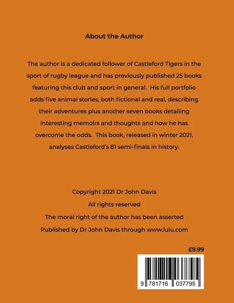 The author is a dedicated follower of Castleford Tigers in the sport of rugby league and has previously published 25 books featuring this club and sport in general. His full portfolio adds five animal stories, both fictional and real, describing their adventures plus another seven books detailing interesting memoirs and thoughts and how he has overcome the odds. This book, released in winter 2021, analyses Castleford's 81 semi-finals in history.