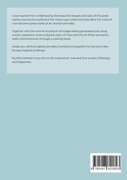 I was inspired from childhood by the beautiful shapes and sizes of the great castles around the world and the many ways rocks and trees after the hand of man became great works of art and functionality. Together with the new AI revolution of images being generated just using words I wanted to share a shared vision of mine and the AI of the wonderful realm of architecture through a coloring book. Inside you will find castles, temples, humble but beautiful homes and a few fantasy inspired buildings. My best wished to you all is to be inspired as I was and find a realm of fantasy and happiness.