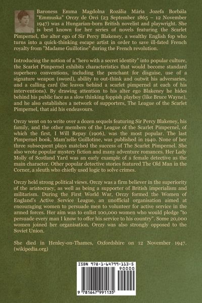 Baroness Emma Magdolna Rozália Mária Jozefa Borbála "Emmuska" Orczy de Orci (23 September 1865 – 12 November 1947) was a Hungarian-born British novelist and playwright. She is best known for her series of novels featuring the Scarlet Pimpernel, the alter ego of Sir Percy Blakeney, a wealthy English fop who turns into a quick-thinking escape artist in order to save ill-fated French royalty from "Madame Guillotine" during the French revolution. Introducing the notion of a "hero with a secret identity" into popular culture, the Scarlet Pimpernel exhibits characteristics that would become standard superhero conventions, including the penchant for disguise, use of a signature weapon (sword), ability to out-think and outwit his adversaries, and a calling card (he leaves behind a scarlet pimpernel at each of his interventions). By drawing attention to his alter ego Blakeney he hides behind his public face as a slow thinking foppish playboy (like Bruce Wayne), and he also establishes a network of supporters, The League of the Scarlet Pimpernel, that aid his endeavours. Orczy went on to write over a dozen sequels featuring Sir Percy Blakeney, his family, and the other members of the League of the Scarlet Pimpernel, of which the first, I Will Repay (1906), was the most popular. The last Pimpernel book, Mam'zelle Guillotine, was published in 1940. None of her three subsequent plays matched the success of The Scarlet Pimpernel. She also wrote popular mystery fiction and many adventure romances. Her Lady Molly of Scotland Yard was an early example of a female detective as the main character. Other popular detective stories featured The Old Man in the Corner, a sleuth who chiefly used logic to solve crimes. Orczy held strong political views. Orczy was a firm believer in the superiority of the aristocracy, as well as being a supporter of British imperialism and militarism. During the First World War, Orczy formed the Women of England's Active Service League, an unofficial organisation aimed at encouraging women to persuade men to volunteer for active service in the armed forces. Her aim was to enlist 100,000 women who would pledge "to persuade every man I know to offer his service to his country". Some 20,000 women joined her organisation. Orczy was also strongly opposed to the Soviet Union. She died in Henley-on-Thames, Oxfordshire on 12 November 1947. (wikipedia.org)