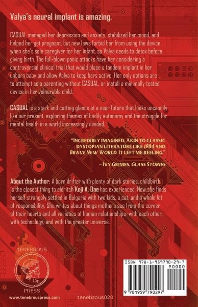 One of LitHub's Most Anticipated Books of 2025! "Eerily believable, incredibly relatable and heartbreaking."Booklist About CASUAL: Valya's neural implant is amazing. Its game-like app, CASUAL, has managed her depression and anxiety, stabilized her mood, and helped the infertile Valya get pregnant. But new laws forbid her from using the device when she's sole caregiver for her infant. Her gaslighting ex won't help her, and she can't afford a nanny, so her obstetrician insists that Valya wean off CASUAL before giving birth. Despite a will to quit and a supportive new love interest in her birthing class, disabling CASUAL turns Valya's anxiety into full-blown panic attacks. Her psychiatrist offers to enroll her in a controversial clinical trial that would place a tandem implant in the baby and allow Valya to keep hers active. Valya must decide whether she should attempt parenting without CASUAL or install a minimally tested device in her vulnerable child. Casual is a stark and cutting glance at a near future that looks uncannily like our present, exploring themes of bodily autonomy and the struggle for mental health in a world increasingly divided.